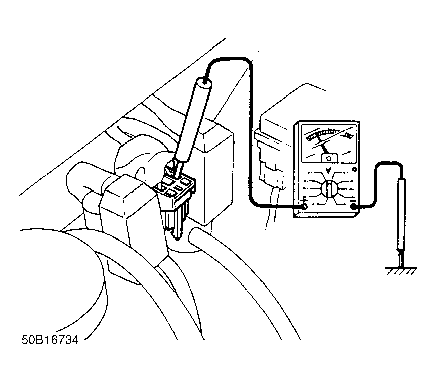 - Check voltmeter indicates 0 volts at approximately 1,500 RPM or higher. If not correct, check connector 2, terminal J (Yellow wire between control unit and ACV solenoid valve) of emission control unit.