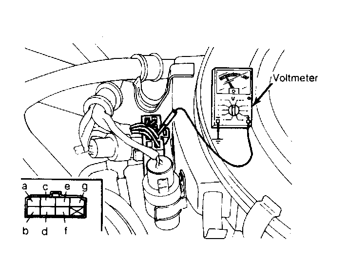 - Bring engine to normal operating temperature and run at idle. Connect a voltmeter to "e" terminal of solenoid valve connector. See Fig 1 .