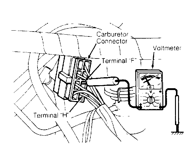 - Connect a voltmeter to terminal "F" (Light Green wire) of carburetor connector. See Fig 1