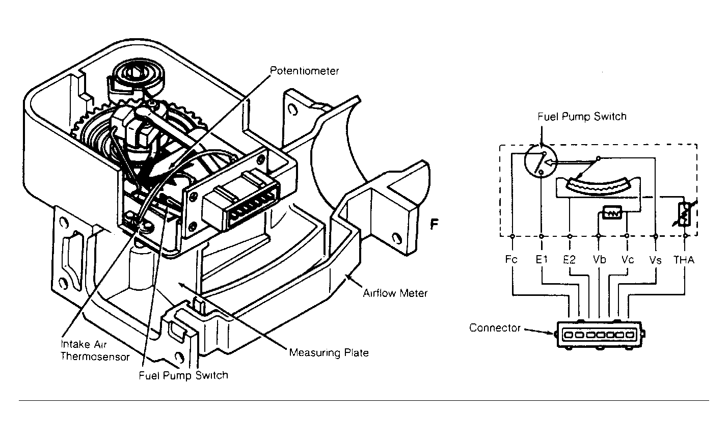 Inspect airflow meter for damage and ensure measuring plate moves smoothly. Disconnect airflow meter connector. See Fig 1 . Measure resistance using AIRFLOW METER TERMINAL RESISTANCE table.