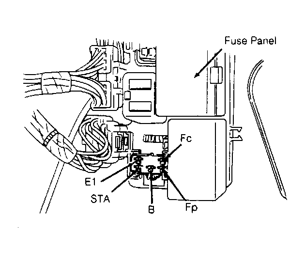 Terminal Condition Specifications Fp Resistance to Ground 0.2-30 Ohms Fc Resistance to Ground (Cranking) Infinite B Voltage to Ground (Ign. On) Battery Voltage STA Voltage to Ground (Cranking) Approx. 9 Volts E1 Resistance to Ground Infinite - With circuit opening relay removed, apply 12 volts to terminal STA of relay. See Fig 2 . Ground terminal E1. Ensure continuity from relay terminals B to FP.