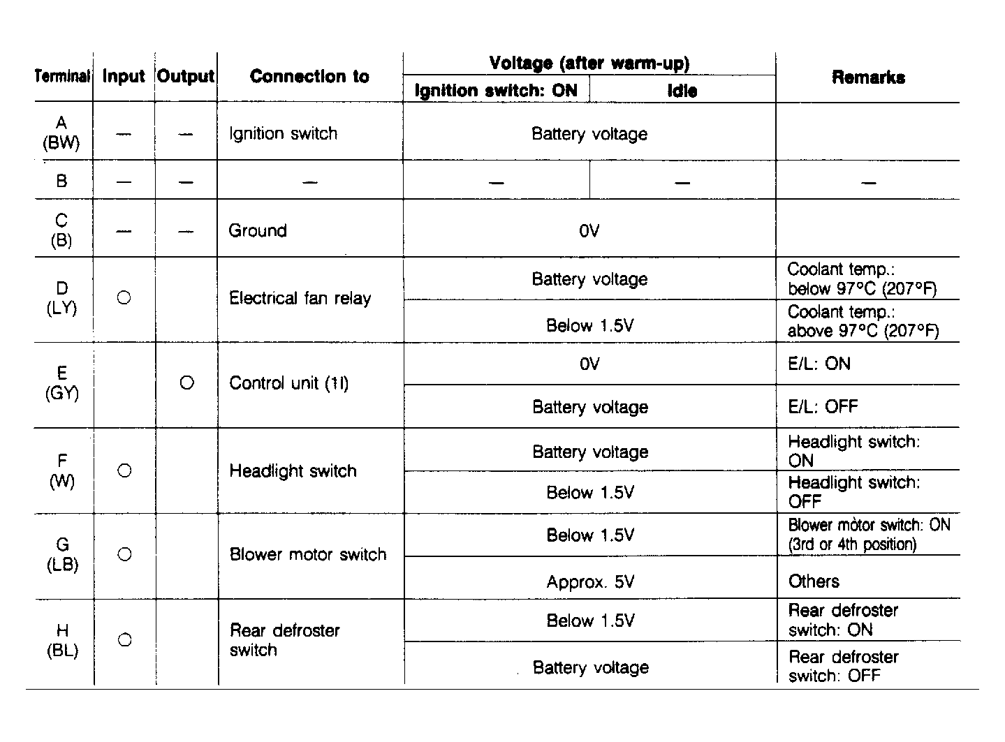 Connect a voltmeter between control unit and ground. Start engine. Check voltage at terminals using ELECTRONIC CONTROL UNIT VOLTAGE CHART. See