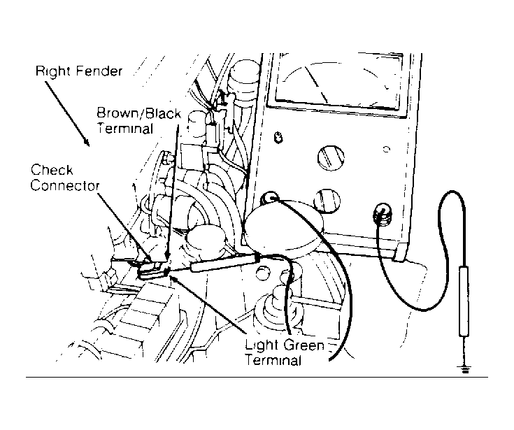 - Bring engine to normal operating temperature and run at idle. Disconnect the neutral switch connector. Connect a voltmeter to the Light Green terminal of check connector, located on the right fender. See Fig 1 .