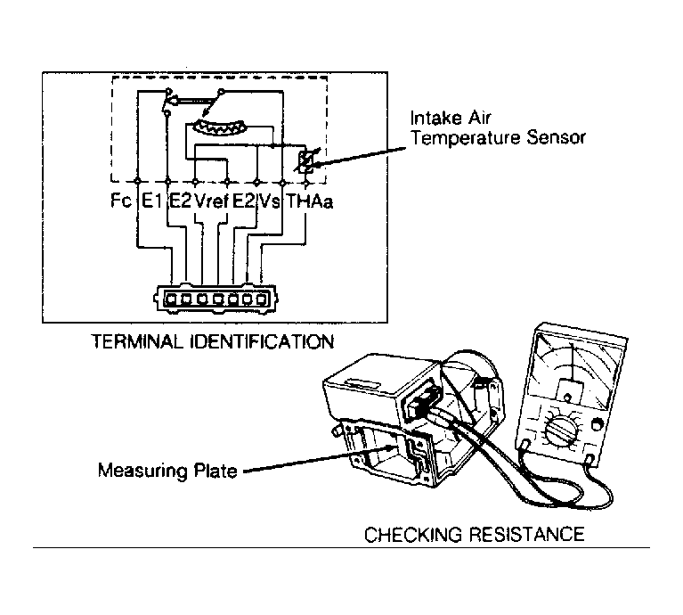 1. Intake air temperature sensor and fuel pump switch are contained in the airflow meter. Determine terminal identification. See Fig 1 .