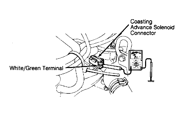 Connect voltmeter to White/Green terminal of coasting advance solenoid valve. Increase engine speed to 3000 RPM and lift idle switch arm. See Figure and Fig 1 . Verify voltmeter indicates appropriate voltage in relationship to engine RPM. See COASTING ADVANCE SYSTEM RPM/VOLTAGE table.