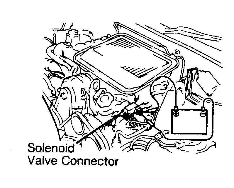 Disconnect solenoid valve connector. See Fig 1 . Measure solenoid valve resistance with an ohmmeter. Resistance should measure 30-34 ohms. Apply 12 volts and a ground to terminals of solenoid valve. Verify valve clicks when voltage is applied. Replace solenoid valve if necessary.