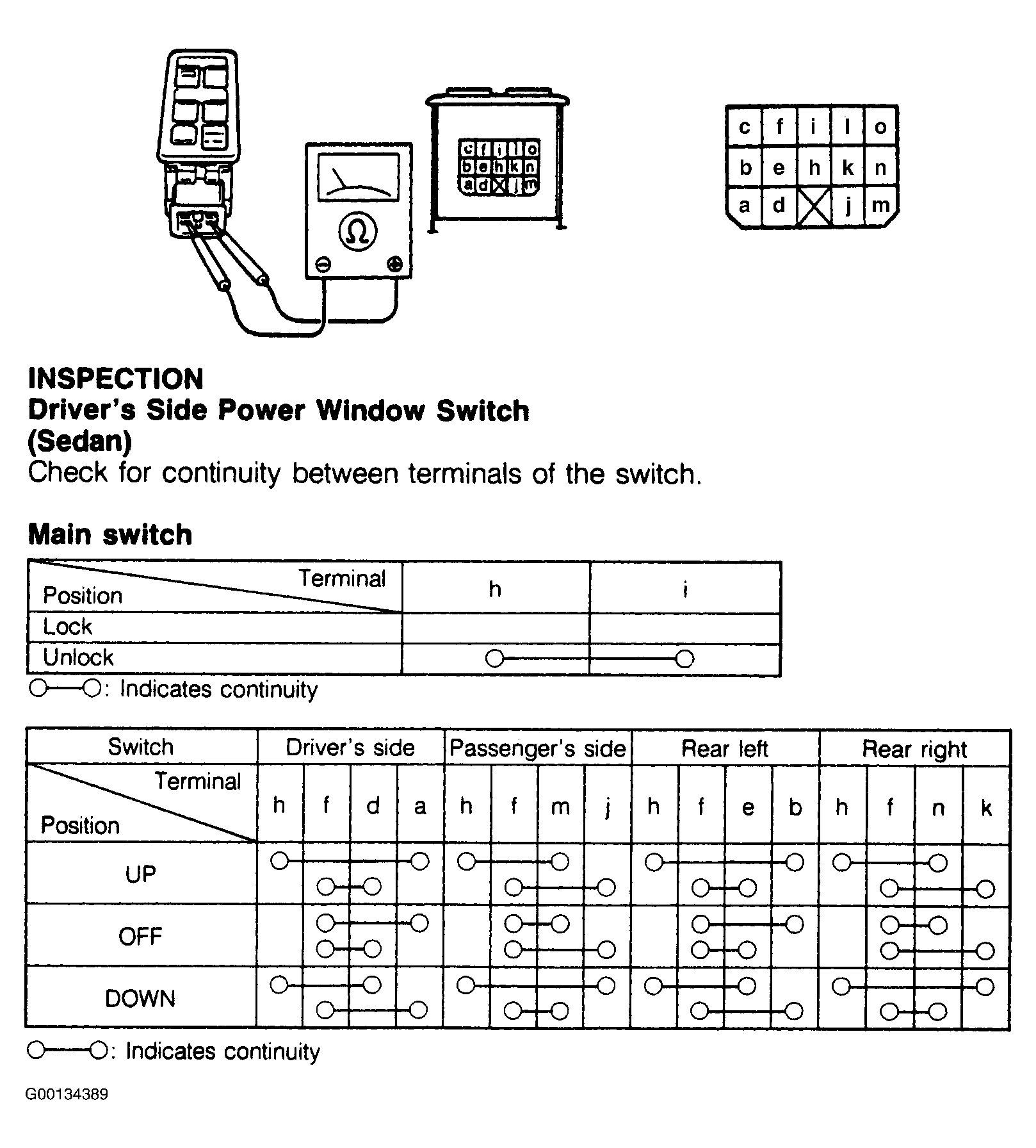 Turn ignition off. Disconnect main switch connector. Check continuity between switch terminals with switch in specified position. See Fig 1