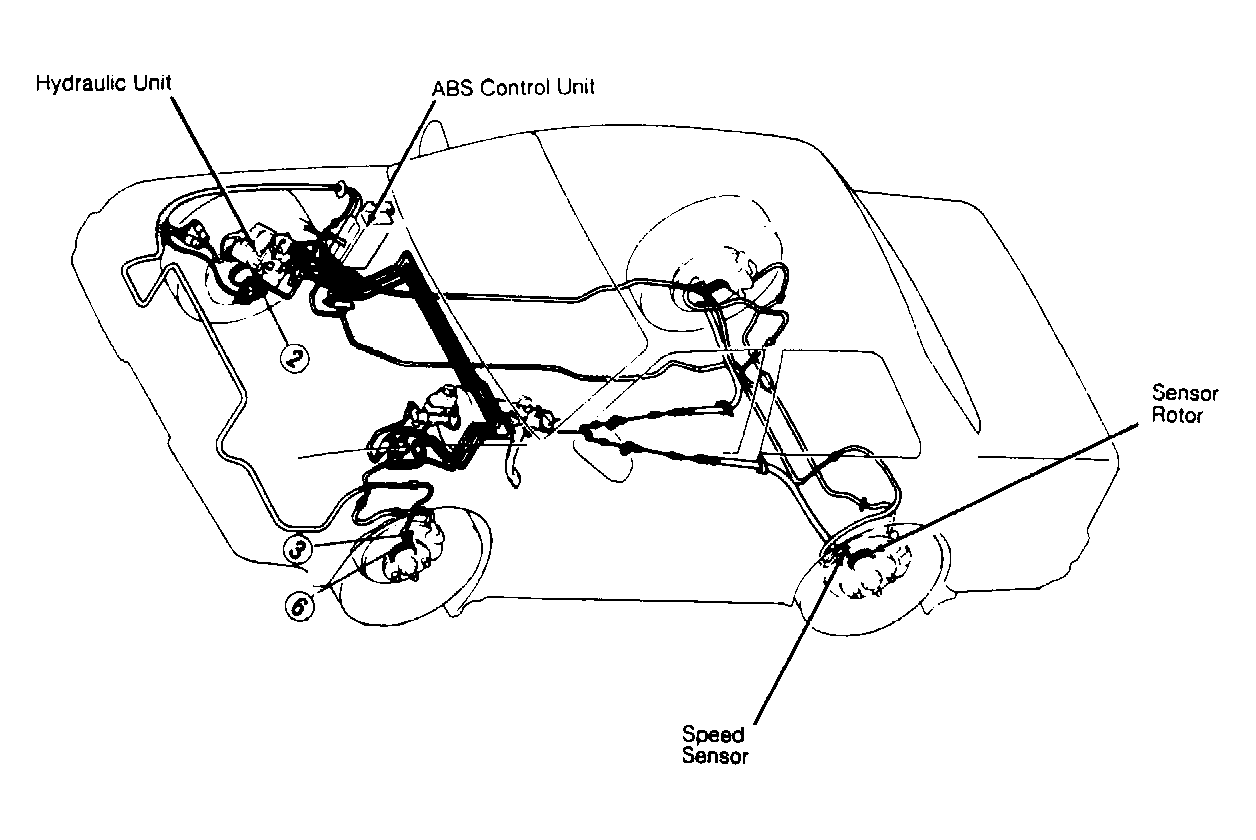 The Anti-Lock Brake System (ABS) control unit senses reductions in front and rear wheel speed, and modulates hydraulic pressure to the brakes to prevent wheel lock-up. The ABS consists of a hydraulic unit, 4 wheel speed sensors and sensor rotors, valve relay, motor relay, pump motor, and ABS control unit. An ANTI-LOCK warning light is located on the instrument panel. See Fig 1 thru Fig 3 .