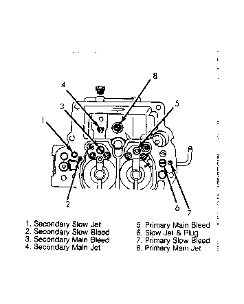 - Remove secondary slow jet, secondary slow bleed, secondary main bleed, and secondary main jet from main body. Remove primary main bleed, slow jet and plug, primary slow bleed and primary main jet from main body. See Fig 1 , Fig 2 and Fig 3 .