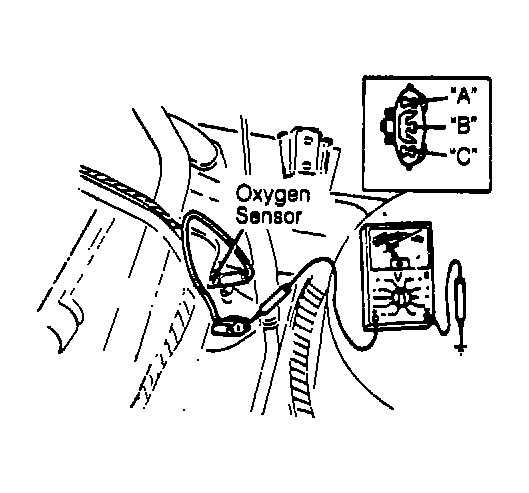 - Warm engine to operating temperature. Run engine at fast idle. Disconnect O2 sensor. Connect a high impedance voltmeter between O2 sensor terminal "A" and ground. See Fig 1
