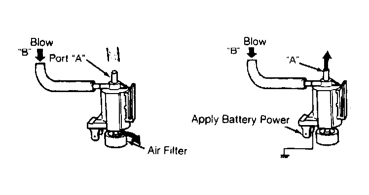 Disconnect vacuum hose from solenoid valve port "A". Blow through port "B". See Figure . Verify air flows from valve air filter. Disconnect solenoid valve connector and connect 12 volts and a ground to solenoid valve terminals. See Figure . Blow through valve port "B" and ensure air flows from port "A". Replace if necessary.