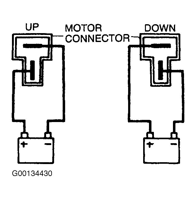 Disconnect the connector of the power window motor. Then check that the window raises and lowers when battery voltage is applied directly to the motor connector. See Fig 1. Replace motor if operation is not normal.