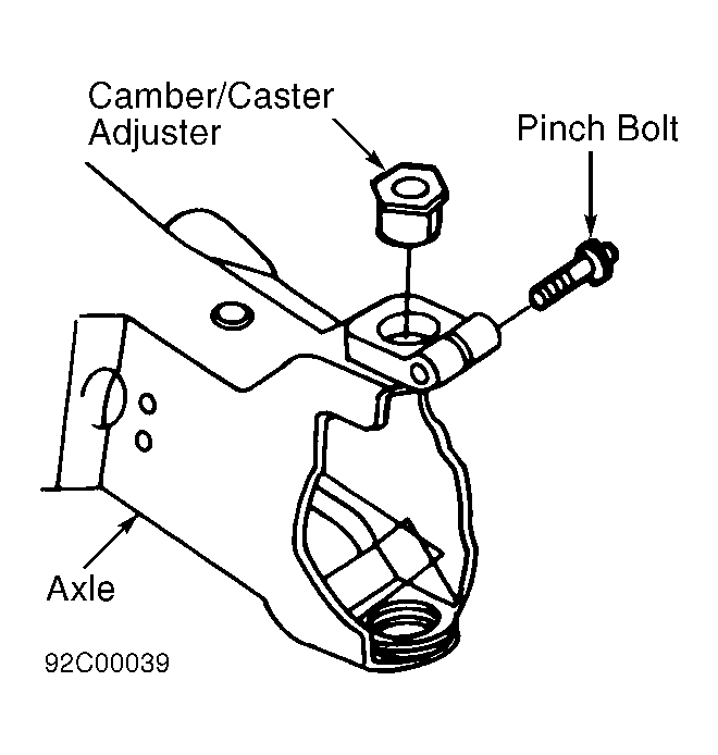 - Remove pinch bolt and camber/caster adjuster from axle. See Figure. Install appropriate camber/caster adjuster and rotate to desired adjustment. See Figure. Install NEW adjuster snap ring. Install caliper, steering knuckle and wheel assembly. Check alignment to verify correct adjustment.