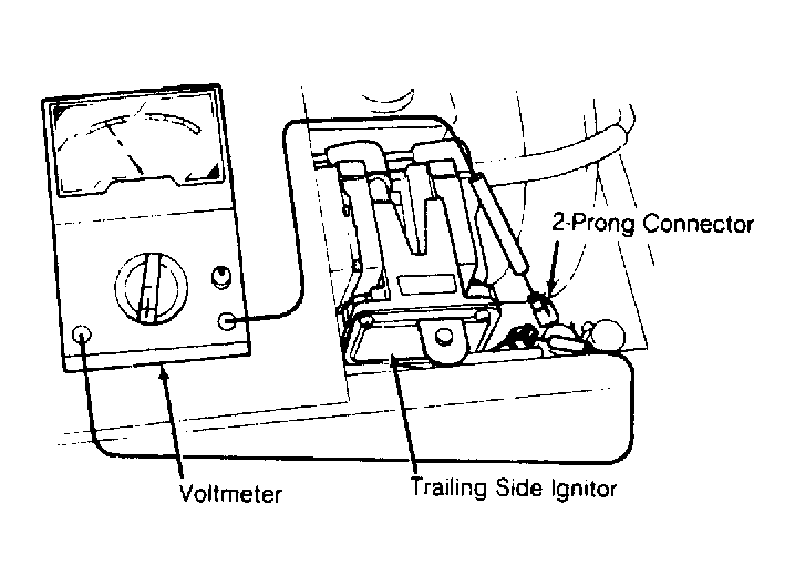 1. Disconnect 2-prong connector at ignitor. Connect voltmeter (in series) between the wire terminals of 2 connector halves. See Fig 1 . Turn ignition on and note voltage.