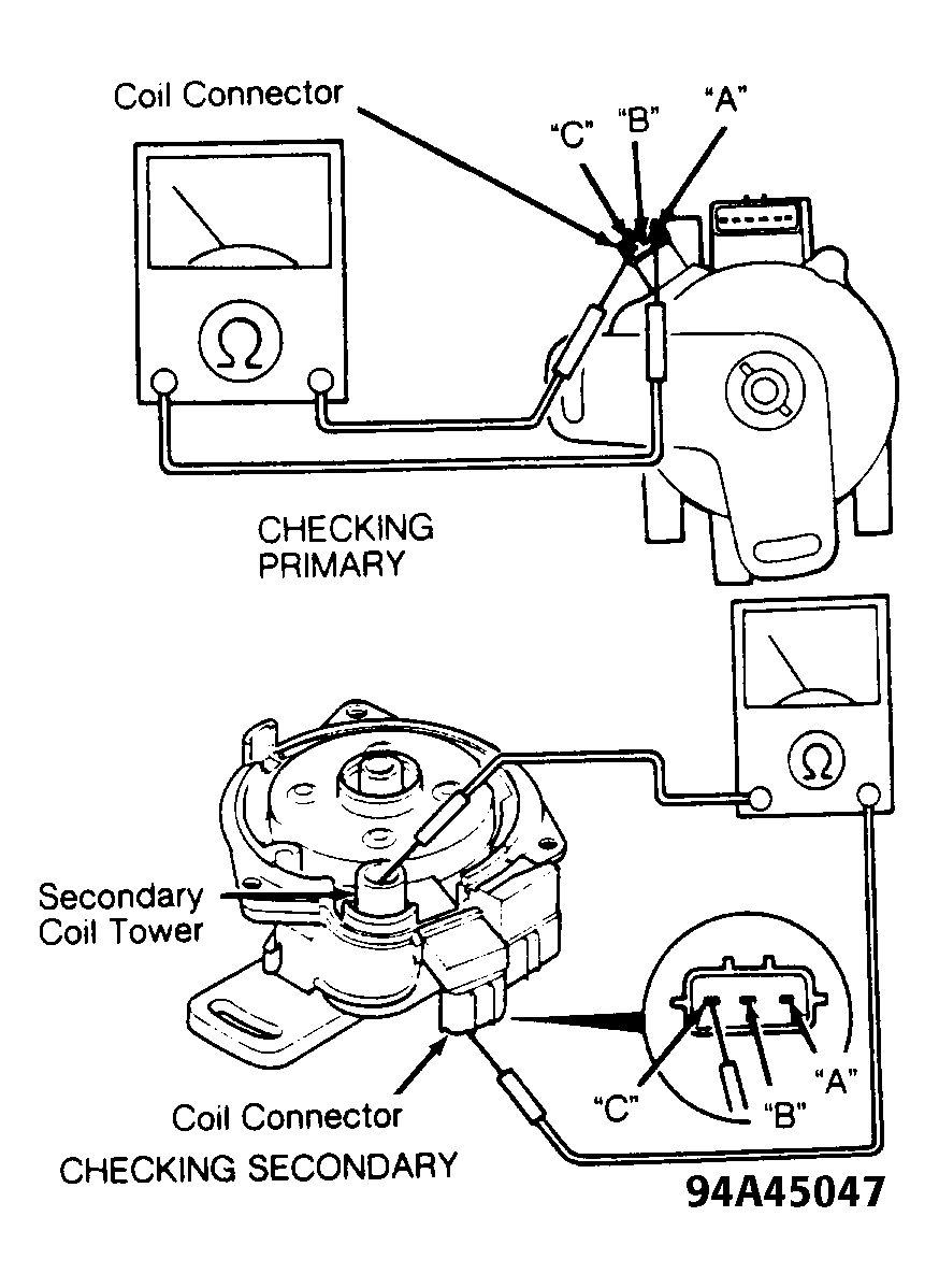 - Remove primary and secondary leads from ignition coil. Using ohmmeter, check primary resistance between terminals "A" and "B" of coil. See Fig 1 . Resistance should be as specified in IGNITION COIL RESISTANCE table. If resistance is not as specified, replace ignition coil.