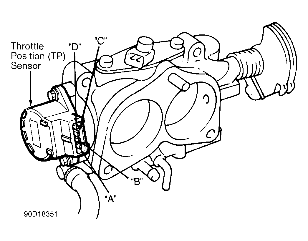 Disconnect TP sensor connector. Using an ohmmeter, measure resistance between specified terminals of TP sensor connector. See TP SENSOR RESISTANCE table. See Figure . If resistance is not as specified, adjust TP sensor. See ADJUSTMENT procedure.