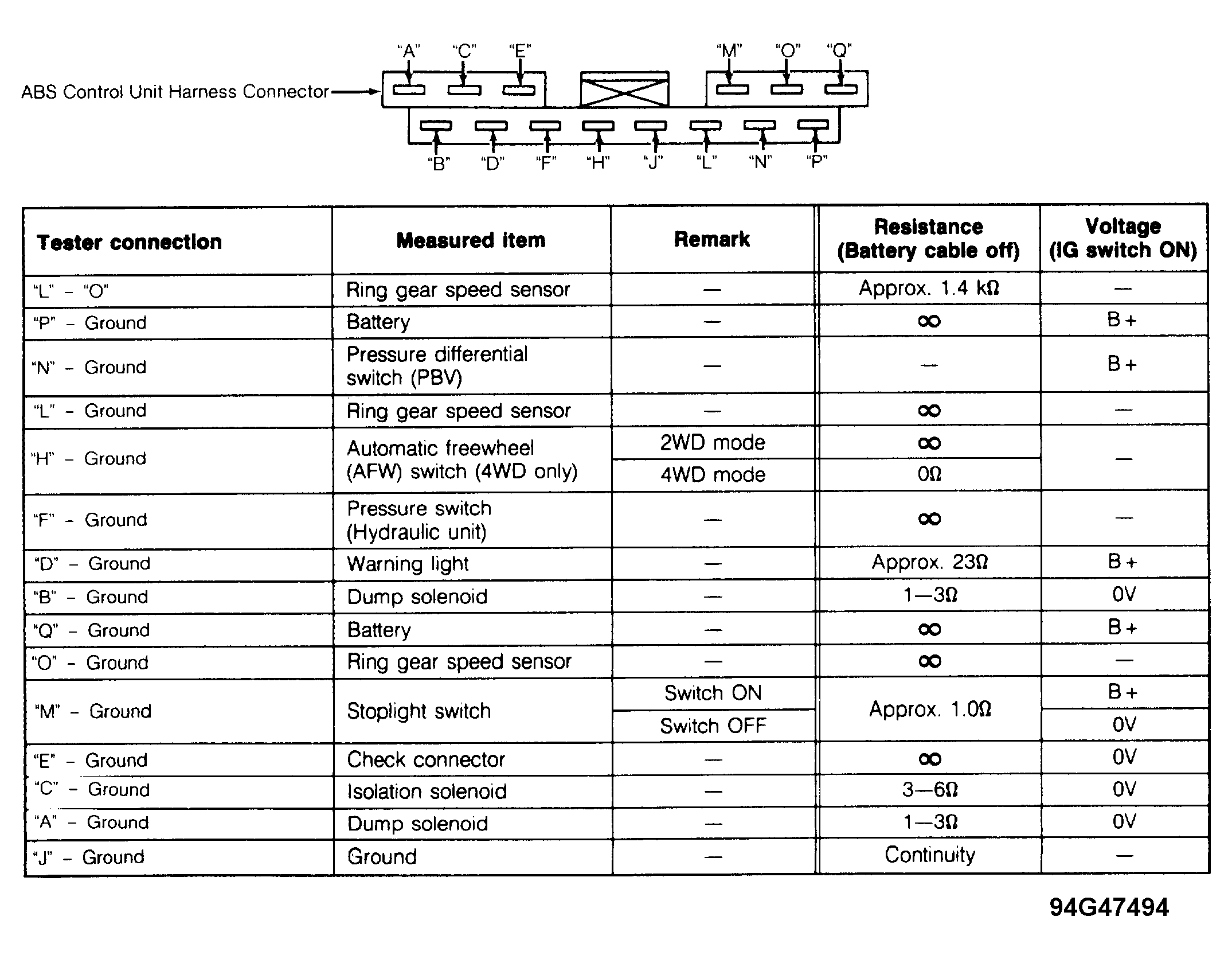 Remove rear side trim. Disconnect ABS control unit harness connector. Check voltage or resistance between ABS control unit harness connector terminals indicated in chart. See Fig 1 .