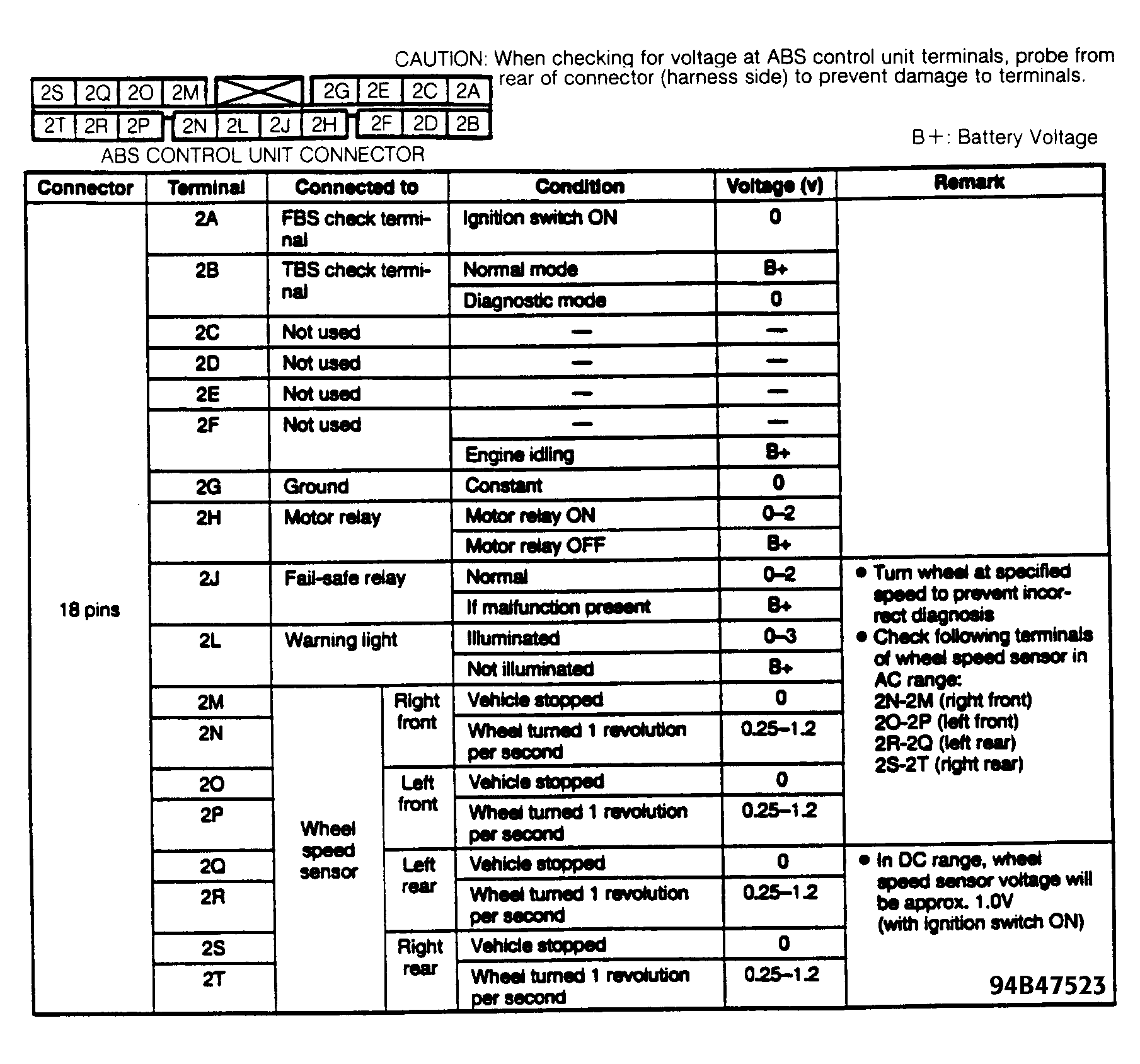 When checking for voltage at ABS control unit terminals, probe from rear of connector (harness side) to prevent damage to terminals. See Fig 1 and Figure .