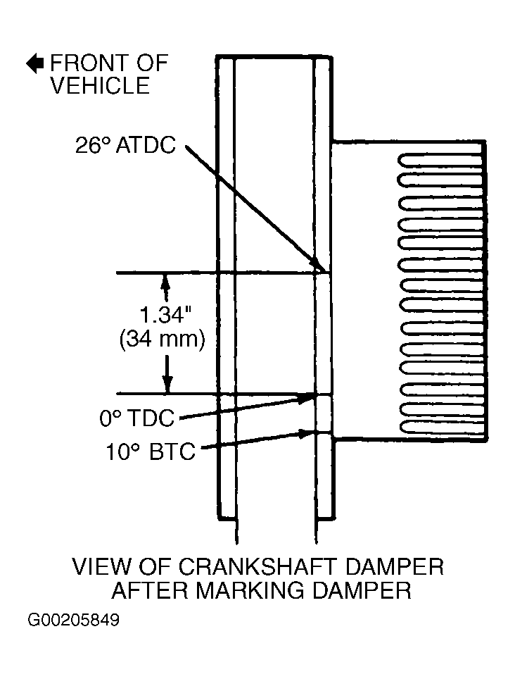 - Rotate crankshaft until TDC mark on damper is accessible. Place a mark on the damper at 26 degrees After Top Dead Center 1.34 inches (34 mm) counterclockwise from TDC mark. See Fig 1 . Rotate crankshaft to position No. 1 cylinder at TDC.