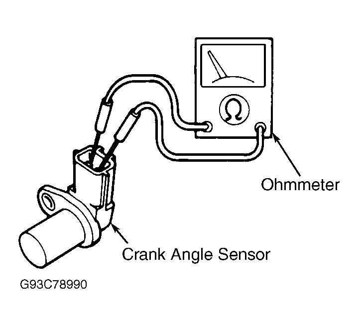 - Disconnect crank angle sensor connector. Crank angle sensor is a separate unit located at front of crankshaft. Measure resistance between terminals. See Fig 1