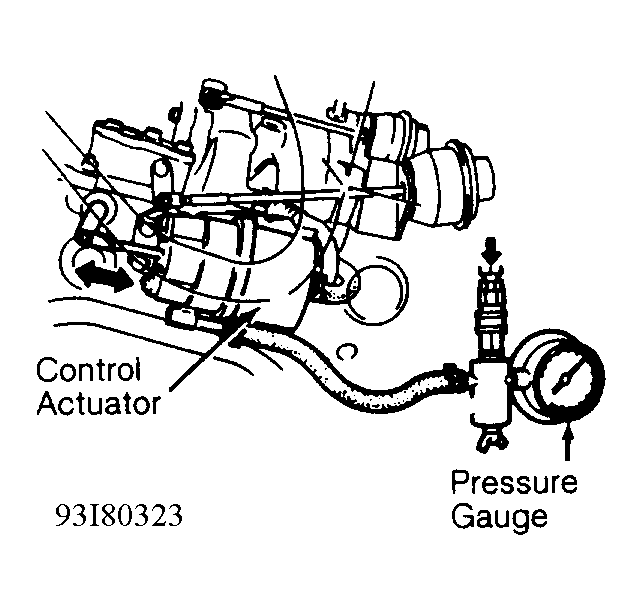 - Ensure engine is cool. Remove hose connected to actuator. Connect air pressure source to pressure gauge. See Fig 1
