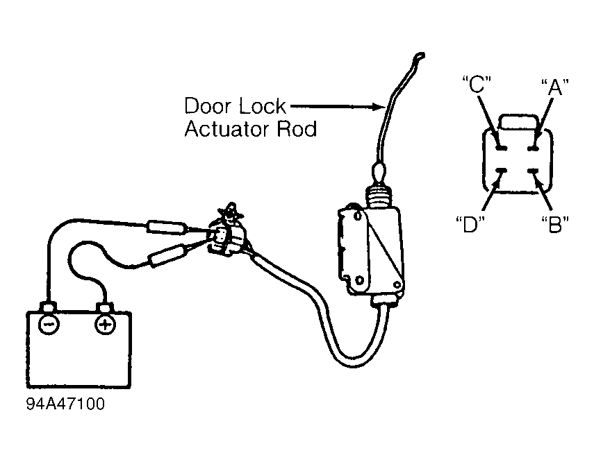 - Connect positive lead of battery to terminal "D" of door lock actuator connector and negative lead to terminal "C" of door lock actuator connector. Door lock actuator should be in unlocked position.