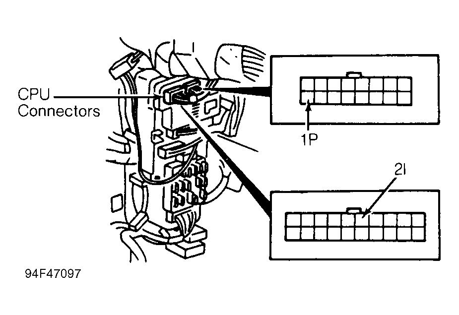 - Measure voltage at terminals 1P (Purple wire) and 2I (Red/Green wire) of CPU connectors. SeeFig 1
