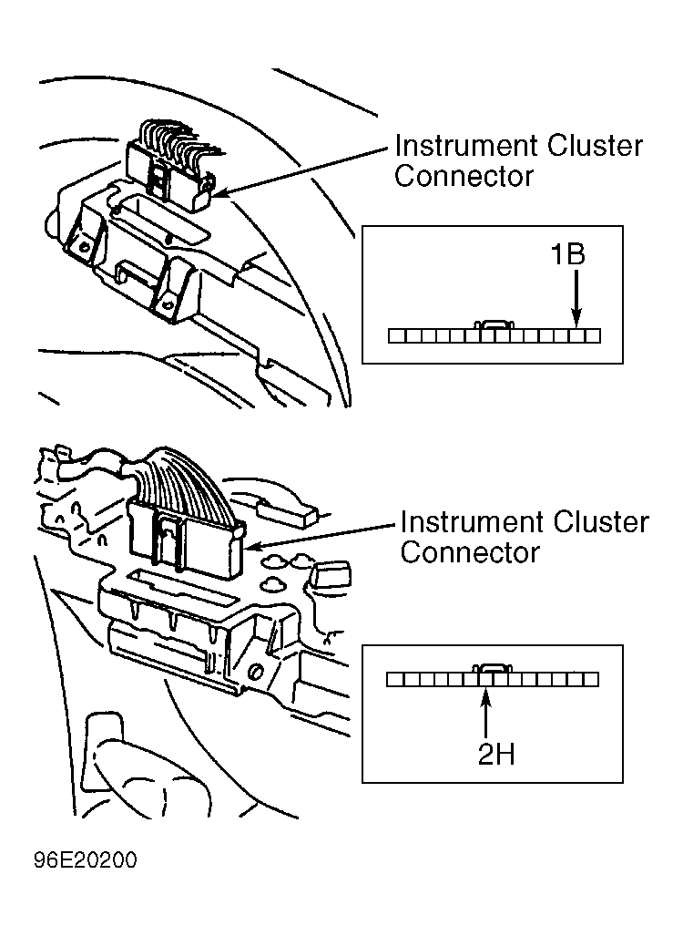 - Using ohmmeter, connect positive lead to terminal 2H (Black/Yellow wire) of instrument cluster and negative lead to terminal 1B (Gray wire) of instrument cluster. See Fig 1