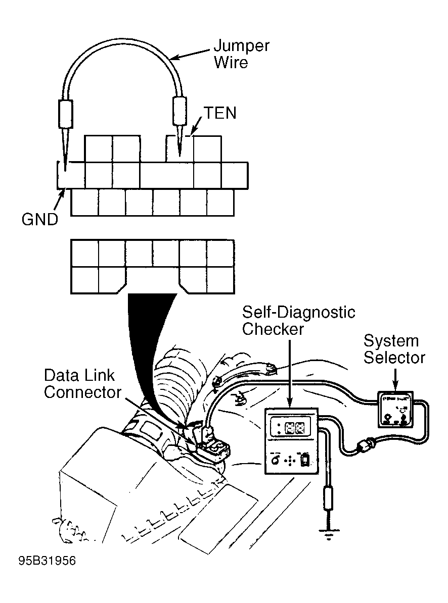 1. If system selector is not available, connect a jumper wire between terminals TEN and GND of data link connector. See Fig 1 . Observe Malfunction Indicator Light (MIL). Note trouble codes. Check TROUBLE CODE IDENTIFICATION  chart for possible cause.