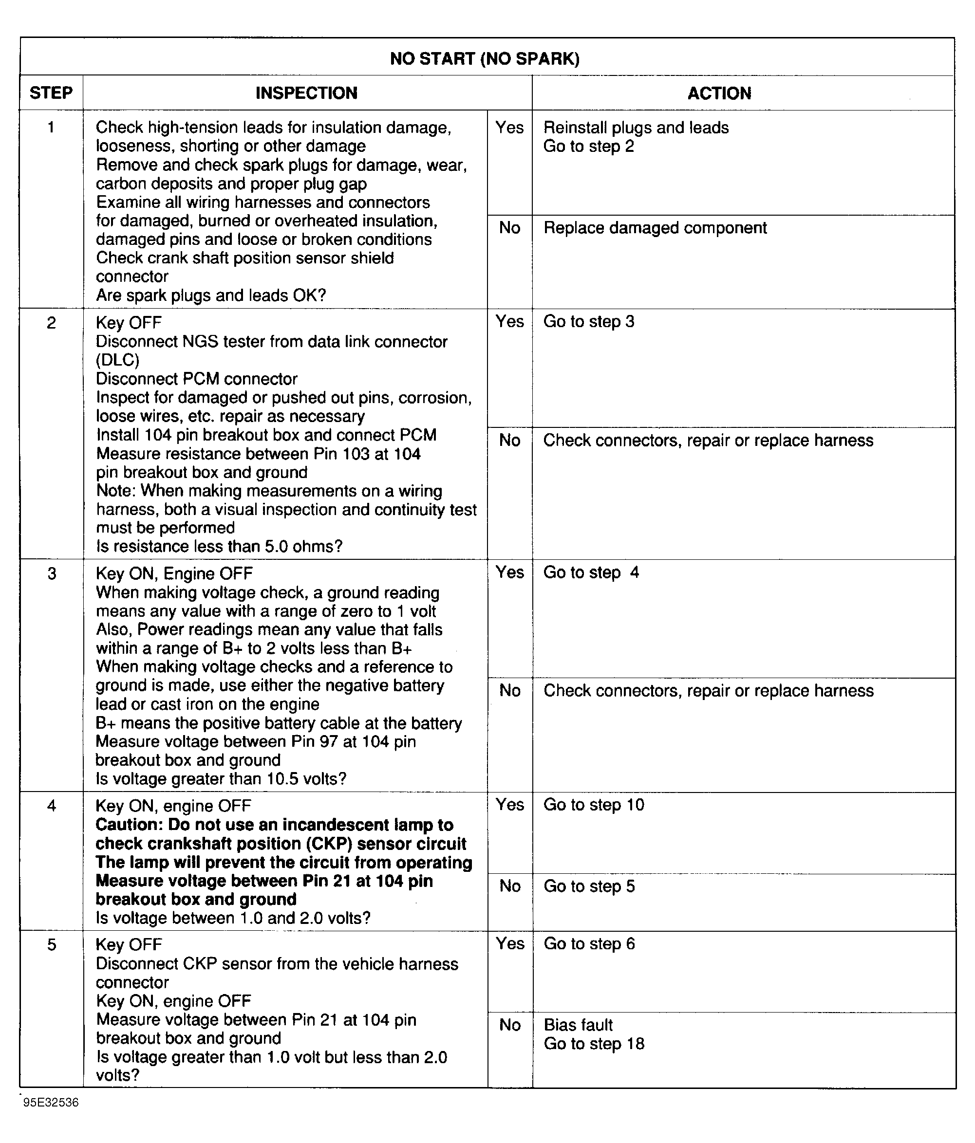 - If no self-diagnostic DTCs exist, proceed to NO START (NO SPARK) DIAGNOSTIC CHART for test procedures.