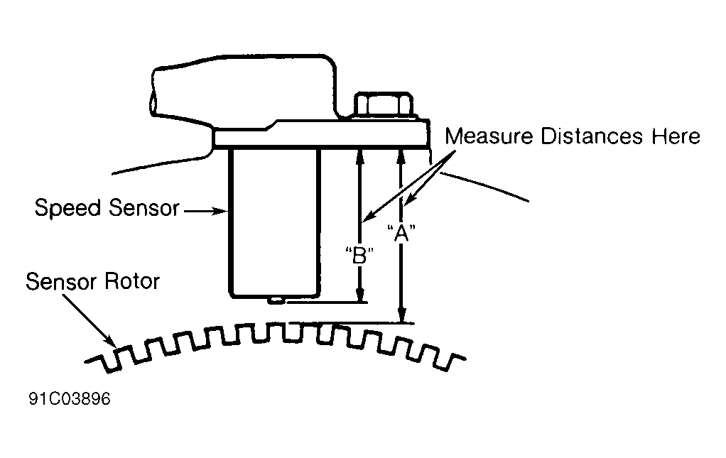 - To calculate clearance, subtract measurement "B" from measurement "A". Clearance should be.020-.047" (.5-1.2 mm). If clearance is less than specification, adjust during installation using Adjustment Shim (P049-27-155). If clearance exceeds specification, replace speed sensor.