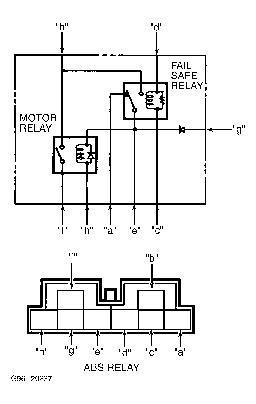 3. Apply 12 volts to terminal "G" and ground terminal "H" of ABS relay. See Figure . Using ohmmeter, check continuity between terminals "B" and "F" of ABS relay. Continuity should exist. If continuity is not as specified, replace ABS relay.