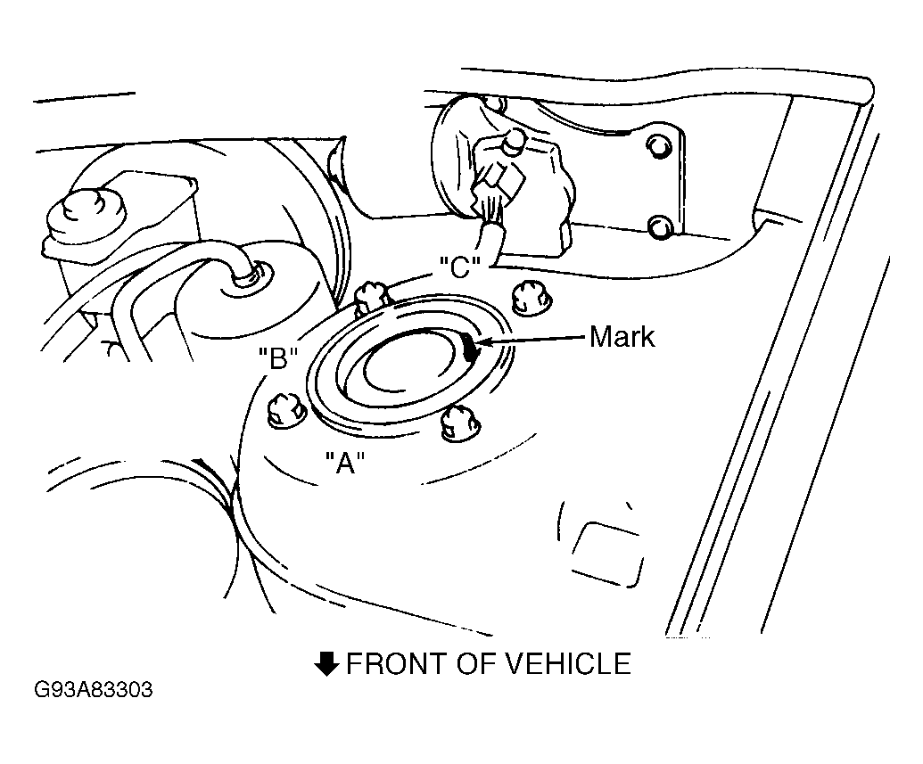 Raise and support front of vehicle. Remove upper strut-to-body nuts. Push strut mounting block downward, and turn to desired position. See Figure . See CASTER ADJUSTMENT (MX-6 & 626) table. Reinstall and tighten nuts to specification. See TORQUE SPECIFICATIONS .