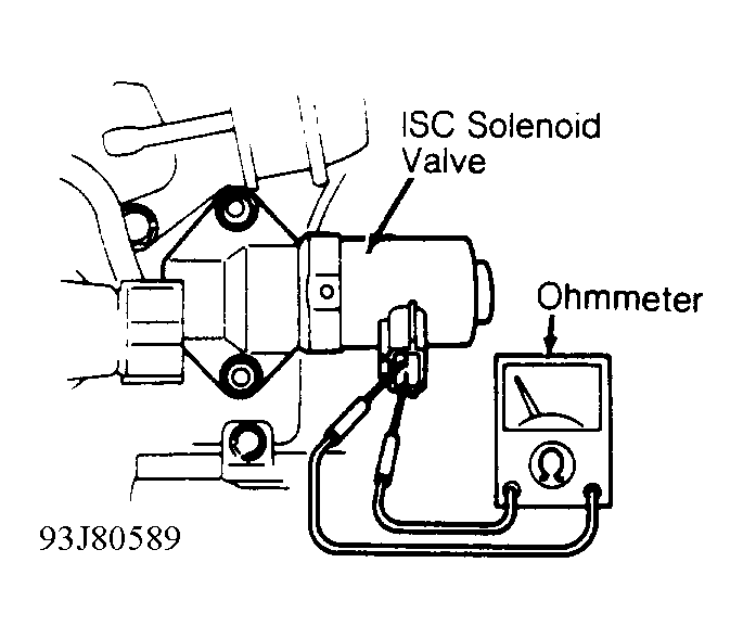 Unplug Idle Air Control (IAC) valve. Connect ohmmeter across 2-wire connector terminals. See Fig 1 . Measure resistance. Resistance should be 10.7-12.3 ohms at 68°F (20°C). If resistance is not within specification, replace ISC valve. If resistance is okay, remove valve and inspect for sludge build-up. Clean or replace as necessary.