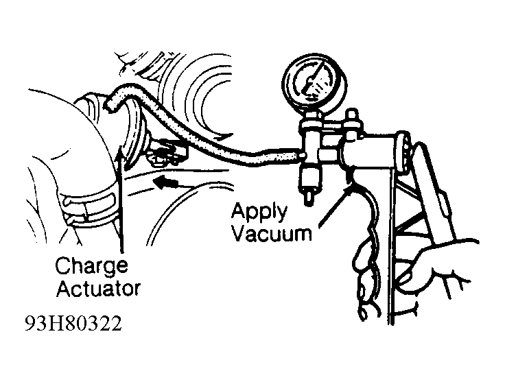 - Ensure engine is cool. Remove hose connected to actuator. Connect vacuum pump to charge control actuator. See Fig 1 .