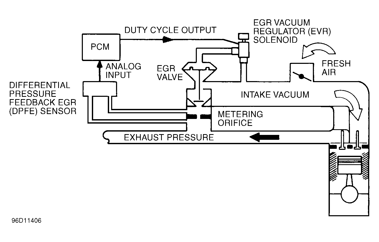 When engine coolant temperature is less than 131°F (55°C), EGR operation is cancelled by PCM to improve driveability. When engine is warm, EGR operation is controlled by PCM and EGR Vacuum Regulator (EVR) solenoid. PCM utilizes inputs from Differential Pressure Feedback EGR (DPFE) sensor along with other sensor inputs to properly balance EGR flow. See Figure .