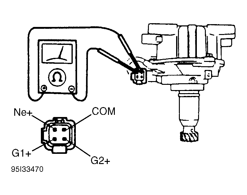 1. Disconnect pick-up coil from distributor. Using an ohmmeter, measure resistance between terminals COM and Ne+, COM and G1+, and COM and G2+ on pick-up coil. See Fig 1 . Replace pick-up coil if resistance is not 205-255 ohms at 68°F (20°C).