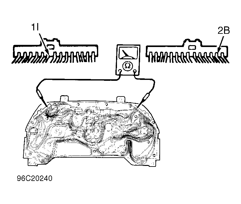 Remove instrument cluster. Remove and check ABS warning light bulb. Replace bulb as necessary. If bulb is okay, using ohmmeter, check continuity between terminals 1I and 2B of instrument cluster connector. See Fig 1 . If continuity exists, repair wiring harness between instrument cluster and ABS control module. If continuity does not exist, replace instrument cluster
