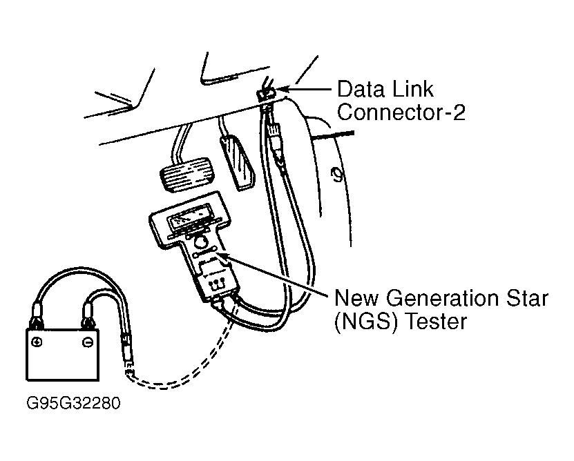 - Connect New Generation Star (NGS) Tool (49 T088 0A0) to data link connector 2 located under left side of dash. See Fig 1 . Using NSG tool, select PID/DATA MONITOR AND RECORD and monitor RPM. Connect Diagnostic Tool (49 B019 9A0) to data link connector. Set SYSTEM SELECT to position 1 and TEST SWITCH to SELF-TEST.