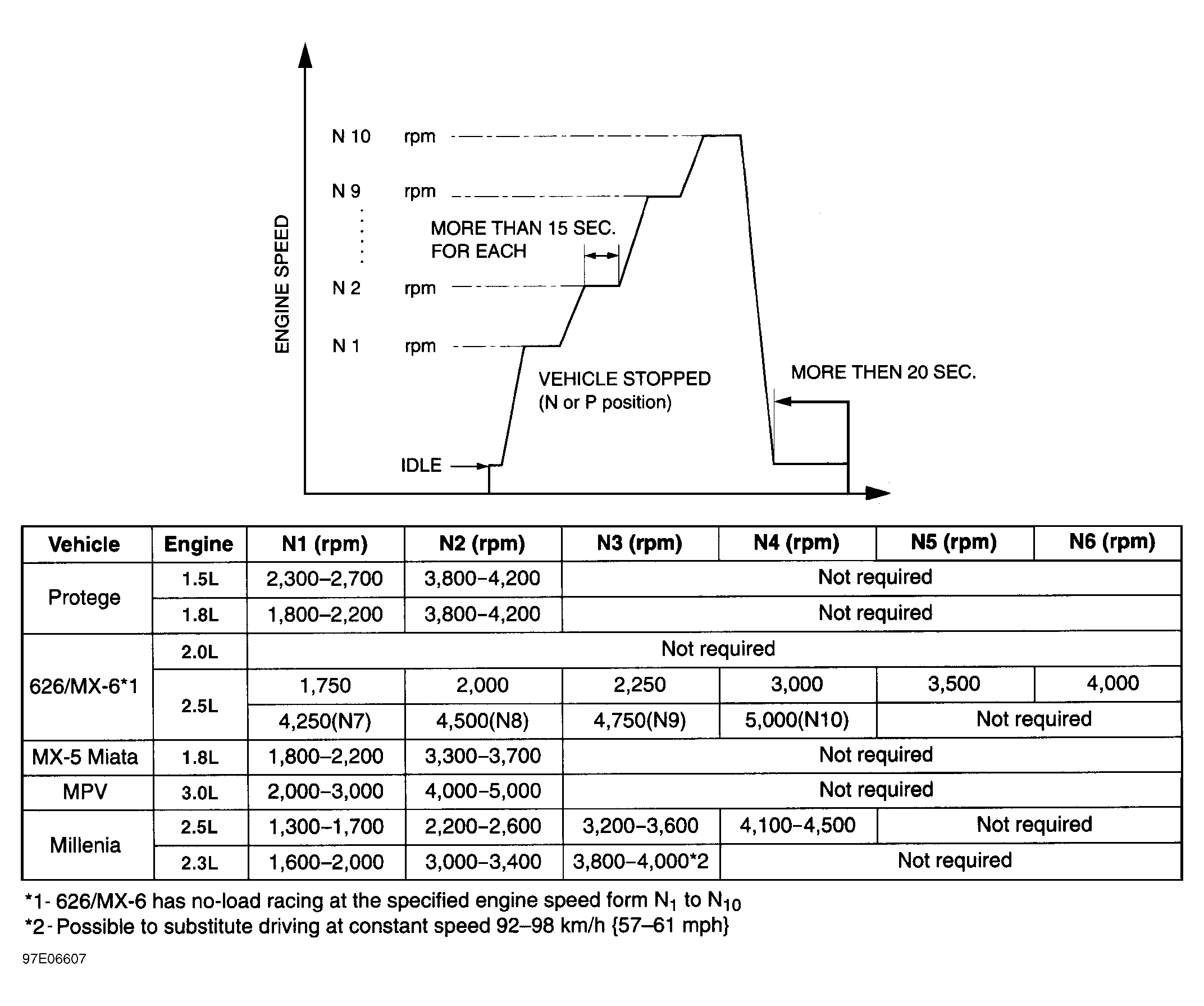 Start engine and warm to normal operating temperature. Ensure all electrical and A/C loads are off. Ensure ignition timing and idle speed are within specification. Adjust as necessary. See BASIC TESTING article. Ensure no jumper wires are connected to DLC. Increase engine RPM to specified speed. See Fig 1. Operate engine at specified RPM for minimum of 15 seconds. Idle engine for more than 20 seconds with cooling fan disabled.