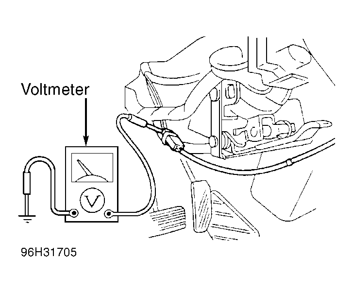 2. Release brake pedal. Voltage should be less than 1.5 volts. With gear selector in any other gear position, voltage should be less than 1.5 volts. If voltage is not as described, check inhibitor switch, brakelight circuit or Central Processing Unit (CPU).