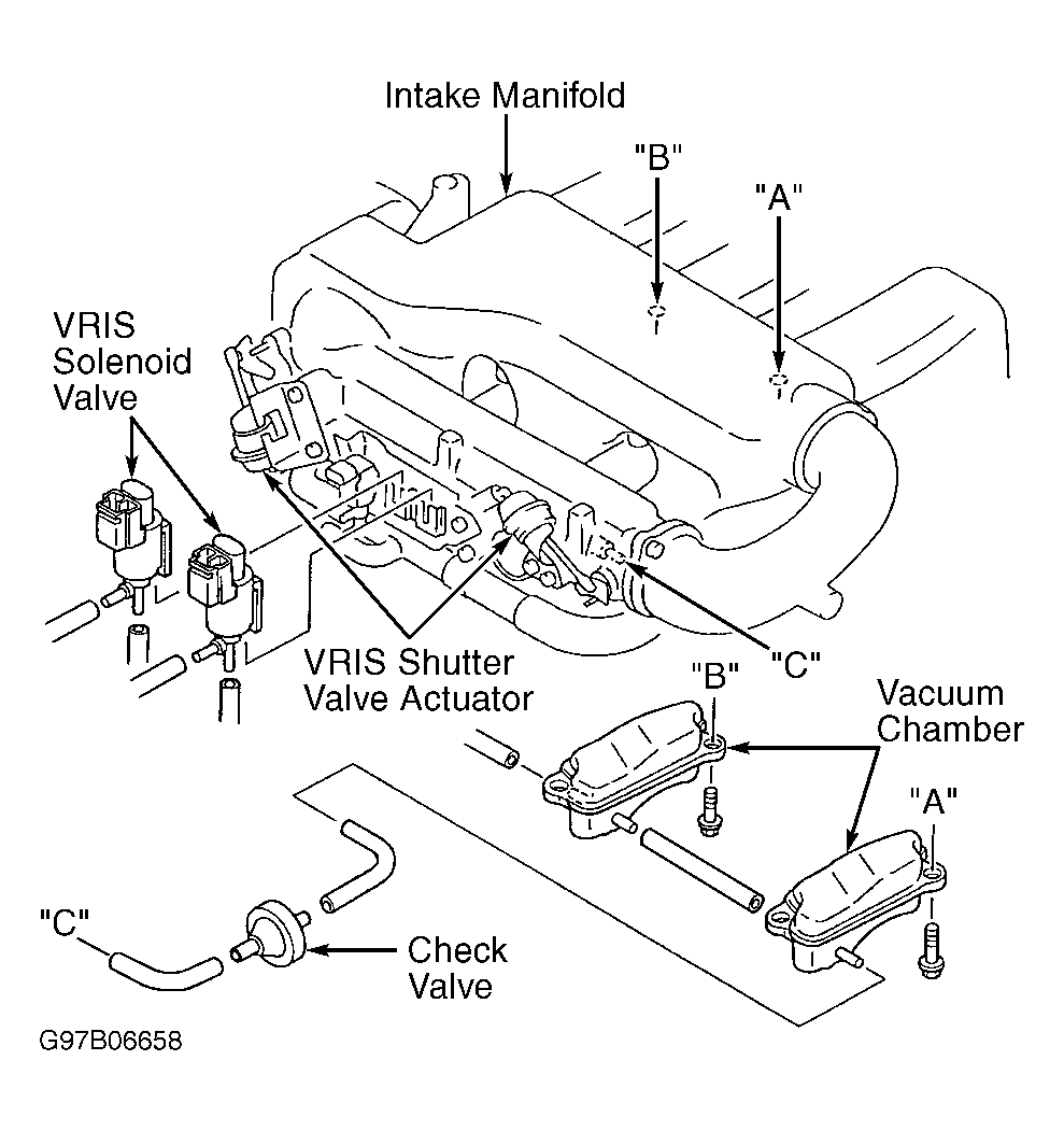 - Start engine. Check Variable Resonance Induction System (VRIS) shutter valve actuator rod positions. See Figure . Rods should not be pulled. If shutter valve actuator rods are not pulled, go to step 4). If shutter valve actuator rods are pulled, go to next step.