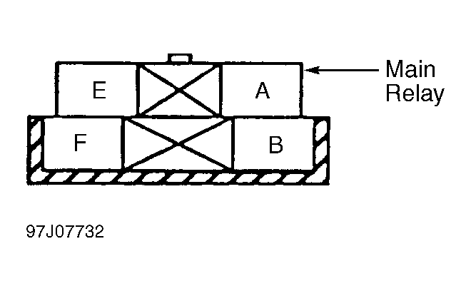 - Using jumper wires, apply battery voltage to relay terminal "E" and ground terminal "A". Check continuity between relay terminals "B" and "F". Continuity should exist with battery voltage applied. If continuity is not as specified, replace main relay.
