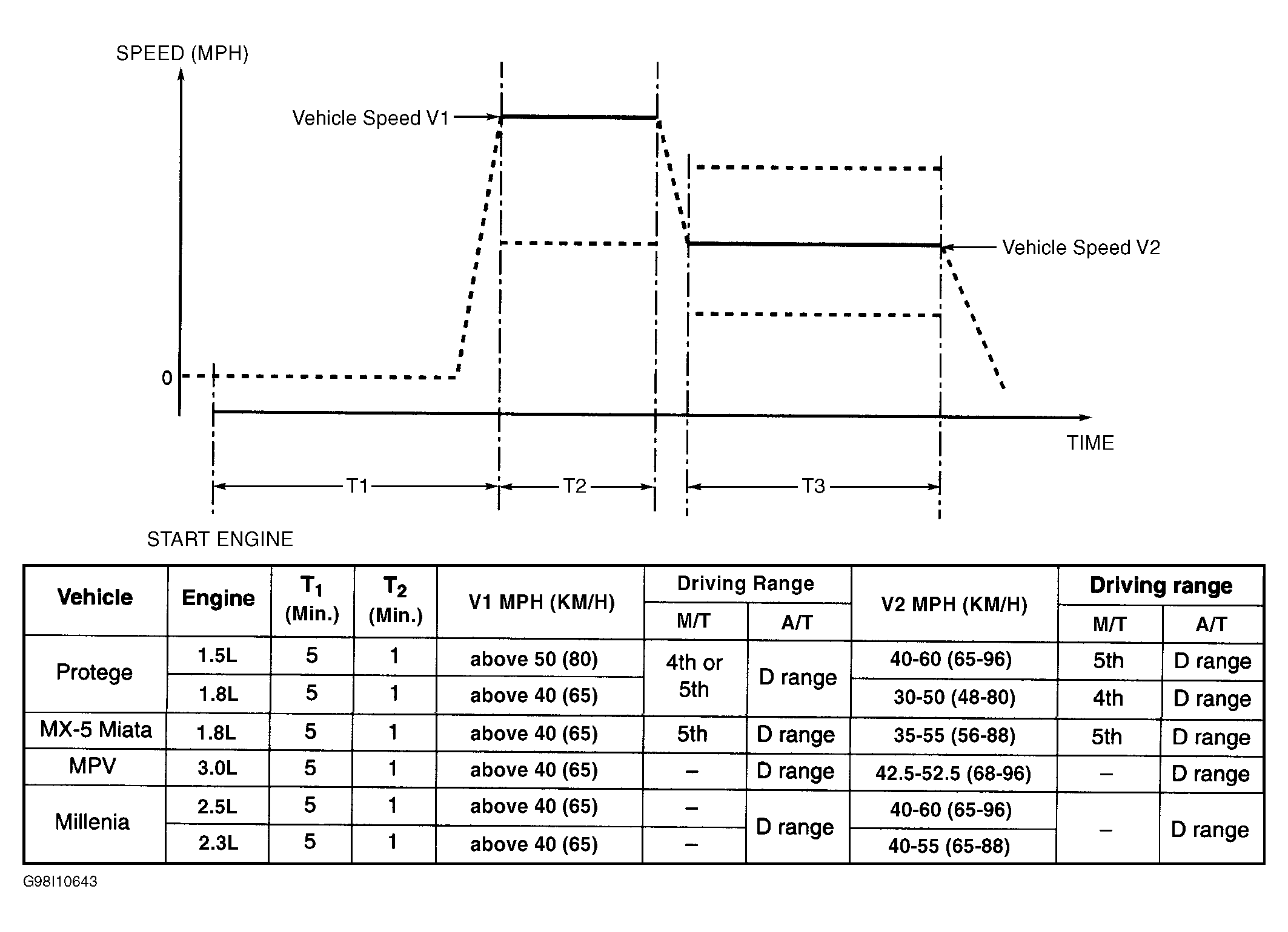 Home >> Mazda >> 1998 >> Protege DX, Automatic >> Repair and Diagnosis >> Engine Performance >> System >> Engine Controls - Tests W/Codes - Introduction >> Self-Diagnostic System >> Drive Cycle Procedure >> Drive Cycle-Mode 3