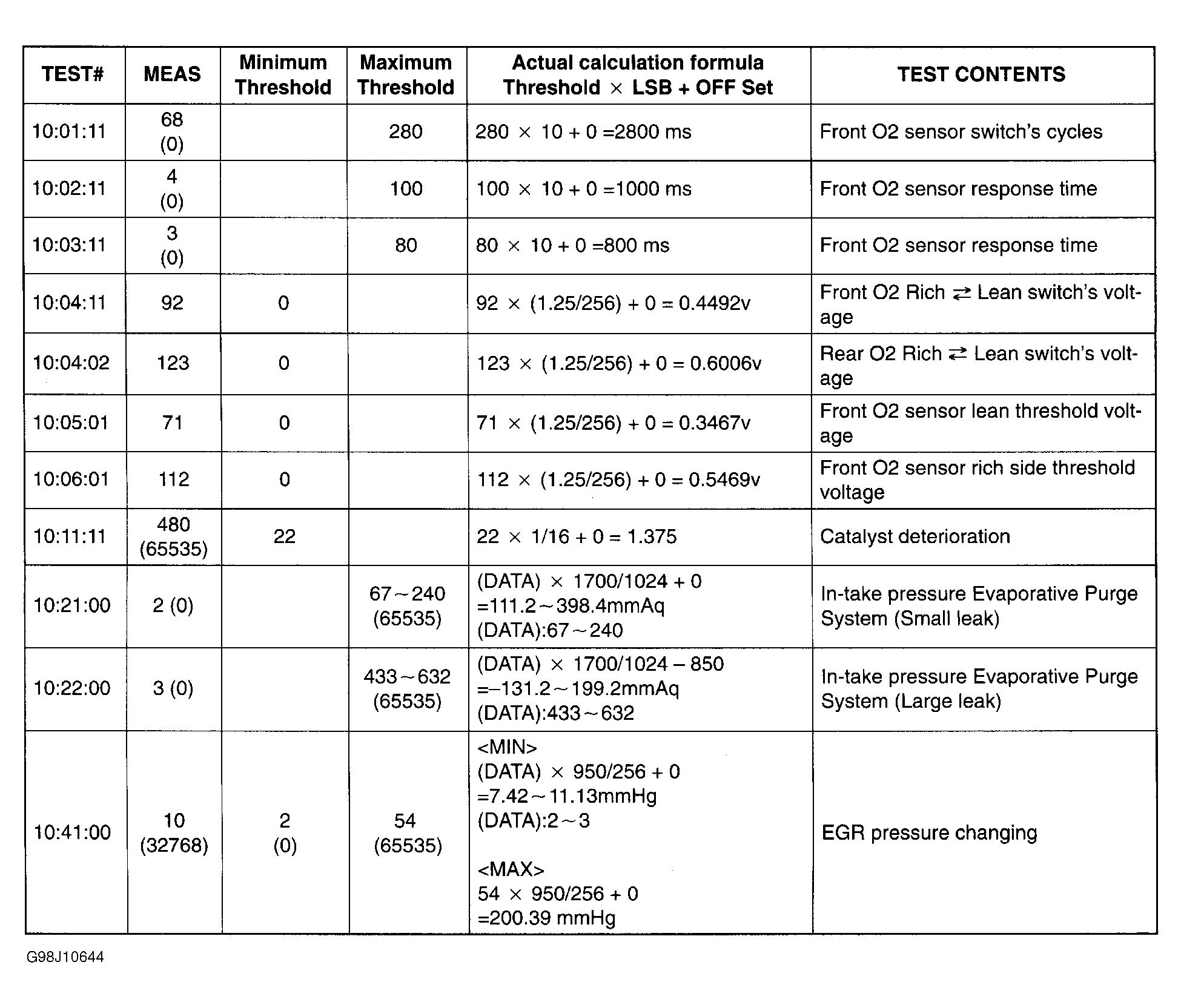 Diagnostic Monitoring Test Results is the intermittent monitor system's technical data which displays system's thresholds and diagnostic results. Intermittent monitor system monitors O2 sensor, evaporative purge system, catalytic converter and EGR system. Technical data and thresholds have initial values. See Fig 1 . If test is not completed, initial values are displayed on scan tool. Initial values are shown in parentheses in MEAS, Minimum Threshold and Maximum Threshold columns. Catalytic converter will sometimes indicate an initial value even if test is completed. O2 sensor will not switch during this condition.
