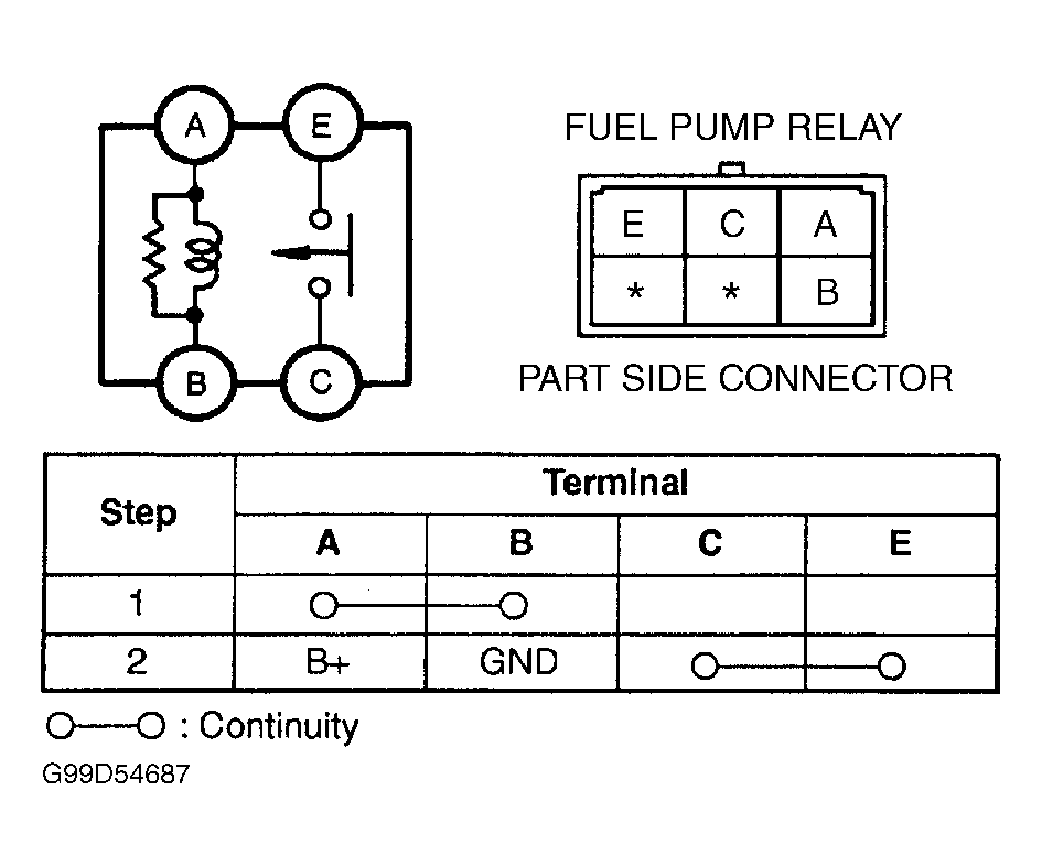 Remove fuel pump relay, located in main fuse and relay box, next to battery. Using ohmmeter, check for continuity between relay terminals "C" and "E". See Fig 1 . Continuity should not exist. Apply battery voltage to terminal "A" and ground terminal "B". Again, check for continuity between relay terminals "C" and "E". Continuity should exist with battery voltage applied. If continuity is not as specified, replace fuel pump relay.