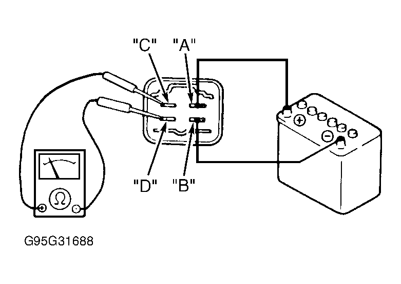 2. Using jumper wires, apply battery voltage to relay terminal "A" and ground terminal "B". Check continuity between relay terminals "C" and "D". Continuity should exist with battery voltage applied. If continuity is not as specified, replace main relay.