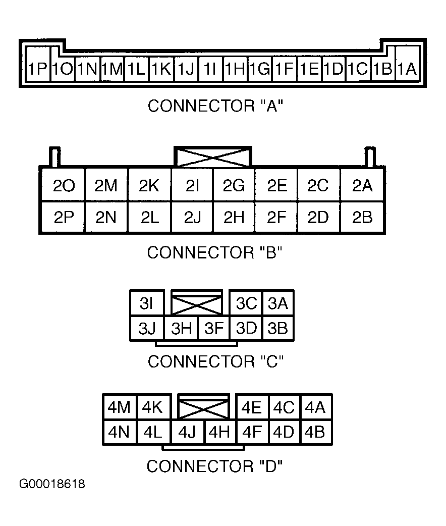 - Locate CPU behind left kick panel. For connector "A", disconnect CPU from joint box and take measurements at CPU terminals. For connectors "B", "C" and "D", using DVOM, leave CPU connectors attached to measure voltage at specified terminals (backprobe connectors). To check continuity, disconnect CPU connectors and measure at specified connector terminal. See Fig 1 -Fig 5 .