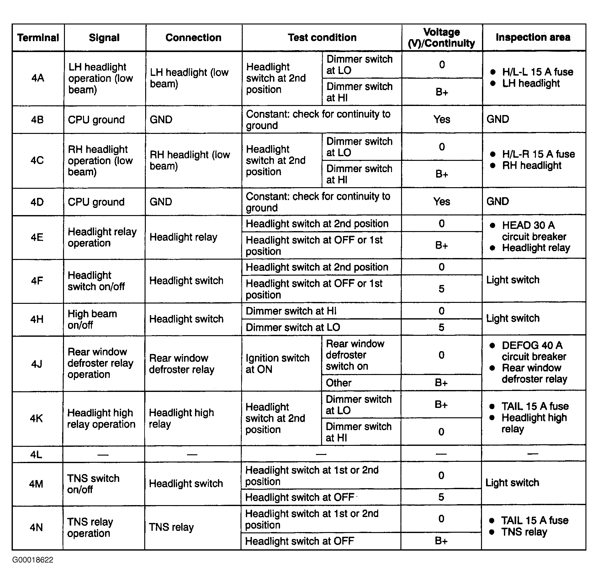 - If voltage measurements or continuity are not as specified, check related components and wiring harnesses. If related components and wiring harnesses are okay, but system is still not functioning properly, replace CPU. See CENTRAL PROCESSING UNIT (CPU) under REMOVAL & INSTALLATION.