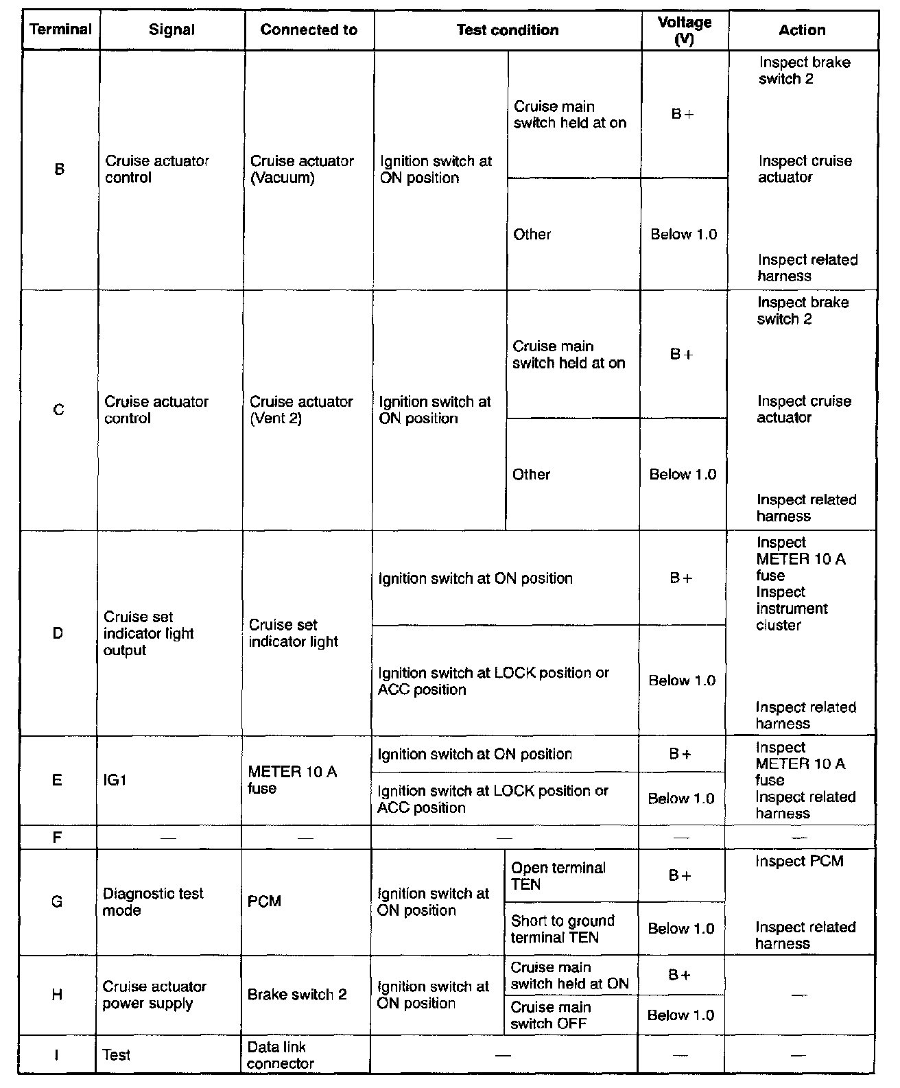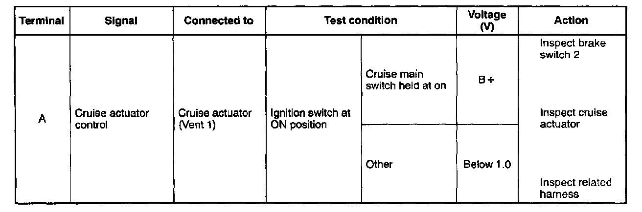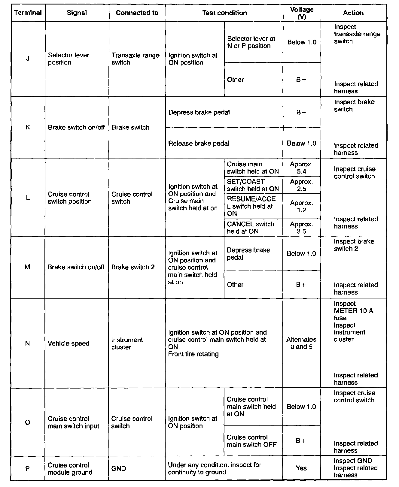 1. Remove the cruise control module without disconnecting the connector.Terminal Voltage Table (Reference) - Connector View: